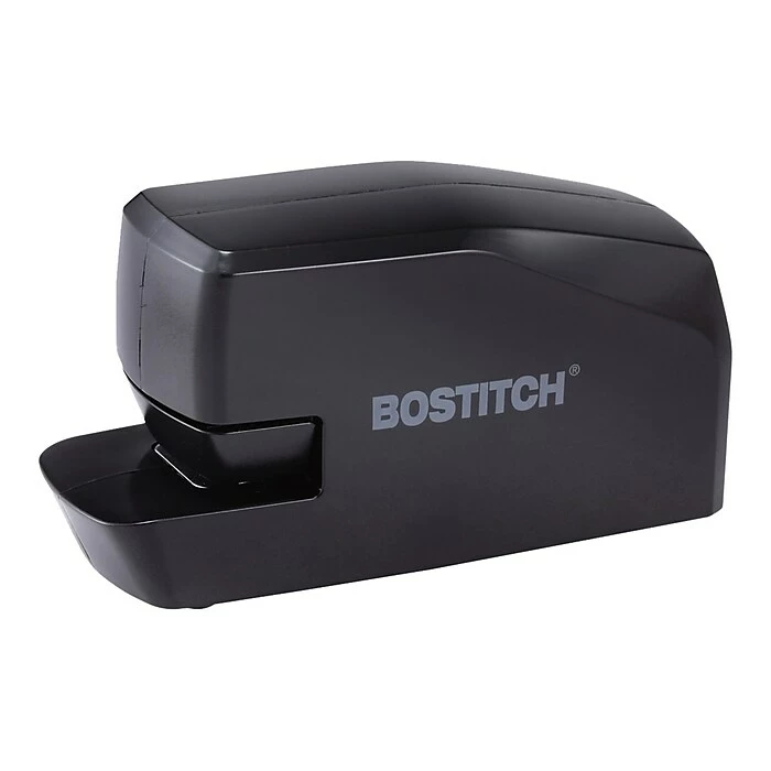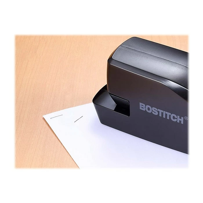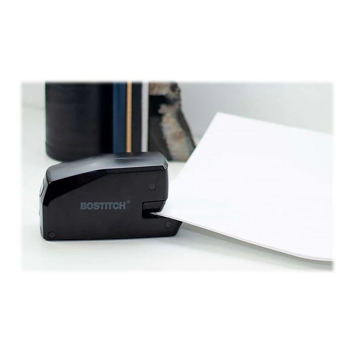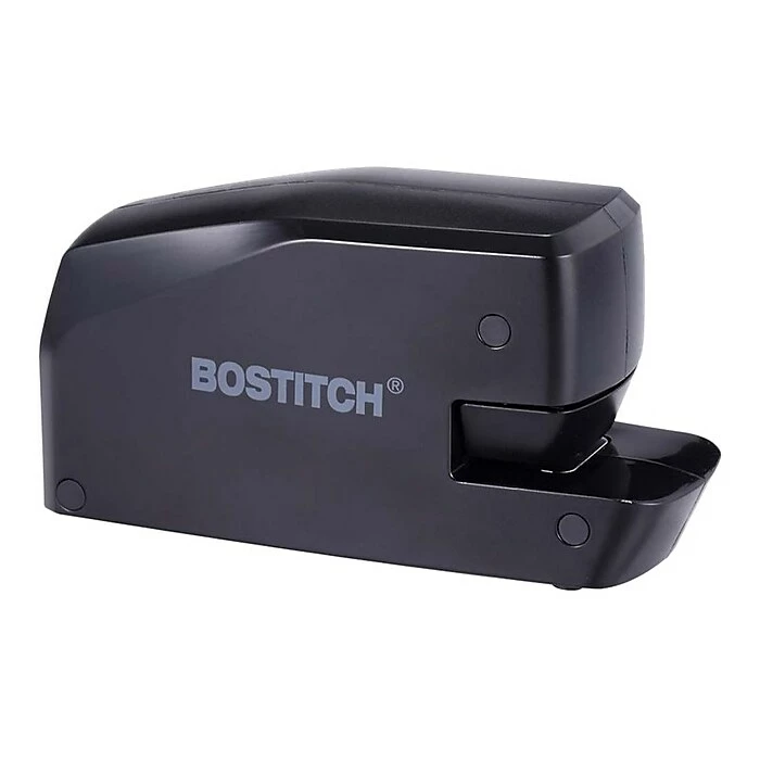 Speed up routine tasks with this stapler. Its quiet motor automatically fastens up to 20 pages, letting you choose the desired angle, and the refillable tray slides out via the push button for easy reloading of standard staples. This Bostitch black stapler operates with an AC adapter, or you can slip in four AA batteries for use while traveling.