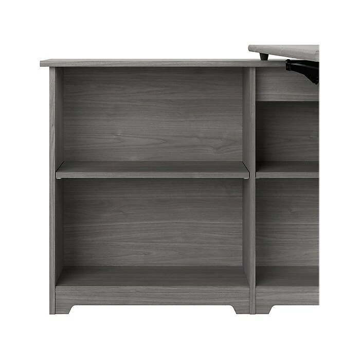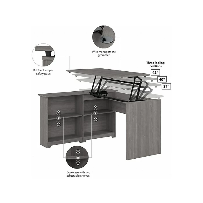 The Bush Furniture Cabot 52″W three-position standing corner desk with shelves presents an ergonomic home office solution with transitional style. Enjoy the freedom to change positions quickly and easily throughout the day with a convenient lift-and-lock desktop that adjusts to three standing desk heights: 37″, 40″, and 42″ from the floor. The durable surface supports up to 20 lbs. when extended, so you can take materials with you while giving your back and neck a break from sedentary work. The adjustable desk’s built-in shelves are perfect for organizing books, supplies, and anything else you need to stay on task. Each shelf supports up to 50 lbs., and the center shelves can be adjusted to accommodate items of various sizes. This ergonomic desk with storage has been rigorously tested to meet or exceed industry standards for safety and performance and is backed by a 1-year warranty.