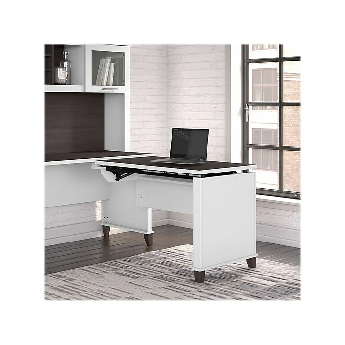 The Bush Furniture Somerset three-position sit-to-stand offers a simple way to turn your computer desk into an ergonomic, height-adjustable workstation. It works with the Bush Furniture Somerset 72″W office desk (sold separately) to form a spacious corner desk with built-in wire management. As a quality alternative to desktop risers, the innovative sit-to-stand return offers all the health benefits of a standing desk with the versatility of more expensive electric height-adjustable options. The mechanical lift-and-lock system allows the desktop to lock into place at standing heights of 35″, 38″, and 41″ and easily returns to a seated position. It is counter-balanced for stability and supports up to 20 lbs. at standing heights. This adjustable desk attachment is rigorously tested to meet Bush Furniture’s standards for safety and performance and is backed by a 6-year manufacturer limited warranty.