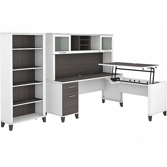 - L-shaped desk with sit-to-stand return, hutch, and bookcase offers an ergonomic solution for home or small office