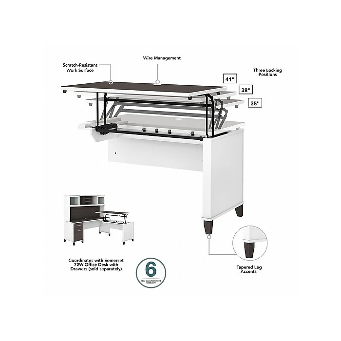 - Lift-and-lock desktop can be set at three standing height positions: 35″, 38″, or 41″; easily returns to seated height