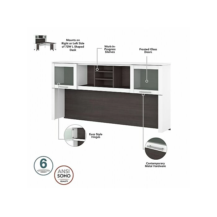 - Hutch attaches to the desktop and features two frosted glass doors for concealed storage