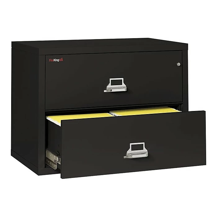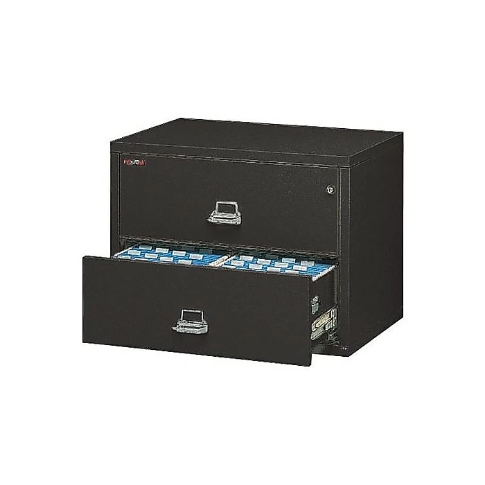 - Two-drawer lateral filing cabinet holds letter- or legal-size documents