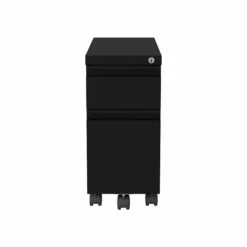 This Hirsh mobile two-drawer vertical file cabinet offers an alternative to standard pedestal file drawers. The narrow design works great for smaller desks. The box drawer holds essential workstation supplies, while the file drawer holds letter- or legal-size hanging file folders. Durable, fully assembled steel construction with a nonporous surface is easy to clean. The lightweight design makes it easy to roll around. Includes a fifth swivel caster for stability, eliminating the need for counterweights.
