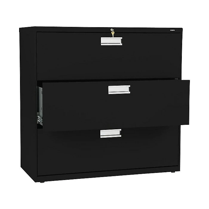 Keep paperwork organized with this HON 600 series three-drawer lateral file cabinet. Its durable steel frame can stand up to everyday use, and the three drawers operate smoothly and quietly thanks to ball bearing suspensions, while a mechanical interlock prevents multiple drawers from opening at the same time. With a two-sided lock mechanism and removable lock core, this HON Brigade 600 series lateral file keeps sensitive documents securely tucked away.