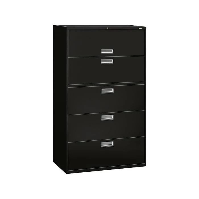 Organize important files and documents with this five-drawer lateral file cabinet. The integrated two-sided locking mechanism prevents unauthorized entry, and the built-in counterweight prevents the cabinet from tipping forward when the drawers are fully extended. This HON Brigade 600 lateral file has heavy-duty steel ball bearings that makes the drawers easy to open and close, and the all-welded case helps the cabinet stand up to commercial environments.