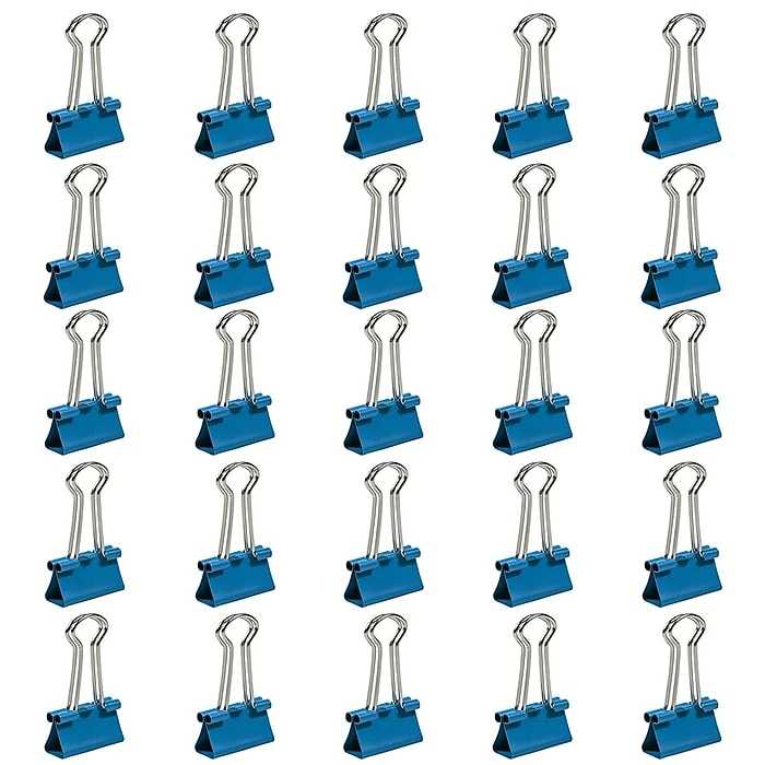 JAM Paper® Designer Binder Clips will get you organized in style! These small size binder clips measure at 19mm and are perfect for organizing and clipping documents together. The movable metal handle can be left upright so you can hang them up, or folded flat for easy storage. These clips are very versatile so use them for more then just clipping papers together! Use them to organize wires or cords, hang them from bulletin boards, or use them as stands for small items. These blue clips are made from durable metal, have a smooth, shiny finish, and are sold in packs of 25.