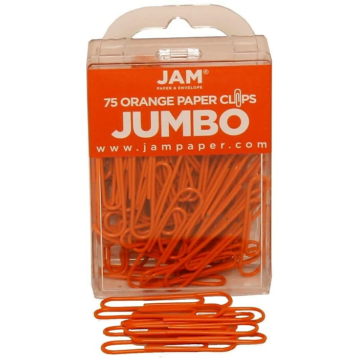 Bright and bold, these orange JAM Paper® Colored Jumbo Paper Clips are just what you need to make a statement with your documents, reports and organized papers. These clips are a particularly bold shade of orange, so they will certainly pop against anything you decide to clip together. These clips are made of smooth metal that is durable and reliable! Use them in the office, around the house and at school. Hey, you might even want to make a cool paperclip bracelet! You never know, the opportunities are endless. These jumbo clips measure 2 inches long and are the largest paperclips we sell. They are able to hold a large amount of papers. These clips are sold in packs of 75.
