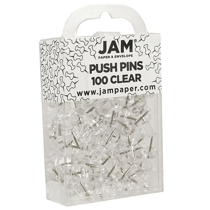 High Quality Pin Assortment/strongbra/When you want your work to stand out, instead of what’s holding it up, JAM Paper® White Push Pins are perfect for you. Let your artwork speak for itself without any distraction. With these push pins, made from sharp metal and durable plastic, you’ll be able to hang anything from tapestries to picture frames. White Push Pins are sleek and efficient. Each one is able to withstand much more weight than it looks like these little guys can handle. Redecorating at home? These push pins can hold up just about any decoration you throw their way. Each box contains 100 Pins, perfect for all of your hanging needs around the house, at the office, or the classroom./pDetails/strongbra / Color: Clearbra / Quantity: 200 Push Pins/p