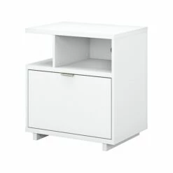 The stylish and progressive kathy ireland® Home by Bush Furniture Madison Avenue lateral file cabinet with shelves presents a storage solution with a modern flair. A perfect choice for home offices, the single-drawer filing cabinet opens on smooth, full-extension ball-bearing slides for an effortless reach to legal-, letter-, and A4-size paperwork. Two open shelves provide a convenient place for books and decorations, and the back panel includes a built-in wire management grommet to accommodate electronics. The surface can also be used to brighten up the room with your favorite pictures and décor. Find the perfect style to complement your work or living space with three attractive finish options.