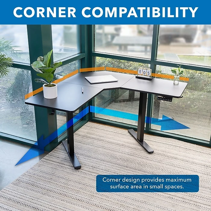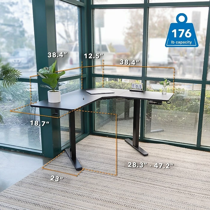 - Desktop dimensions: W (sides) 38.38″, D (sides) 18.7″, Corner W 12.52″
