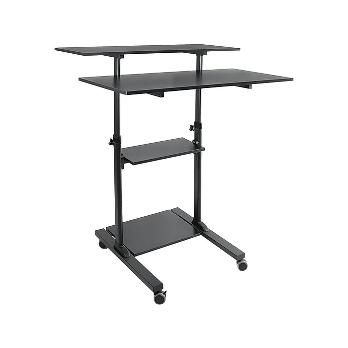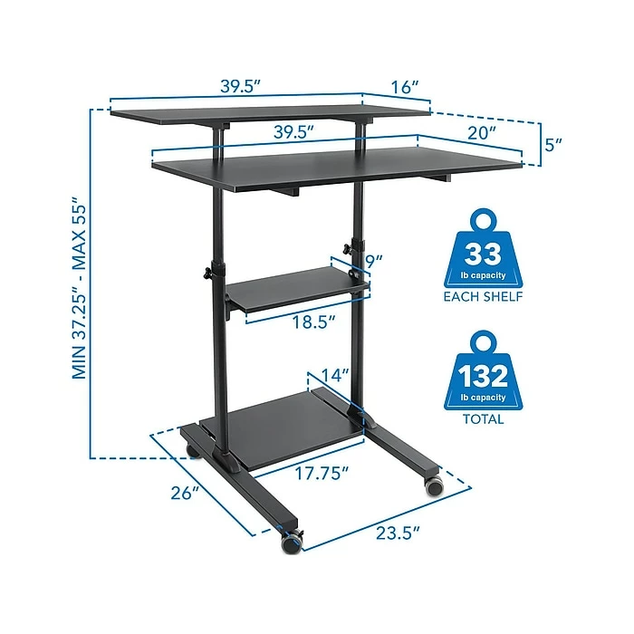 - Adjustable rolling stand up desk consists of one shelf for monitor/computer/laptop, one shelf for keyboard/mouse, one utility shelf, and one shelf for system unit or accessories