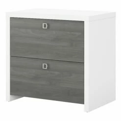 The Office by kathy ireland® Echo two-drawer lateral file cabinet organizes the home or professional space while expressing your uniquely fashionable tastes. Feel inspired by the beautiful blend of an attractive finish and stylish satin silver hardware. Designed to make organization easy, the contemporary lateral file cabinet contains two spacious drawers that open on full-extension ball bearing slides for an effortless reach to letter- and legal-size documents. The file cabinet provides an impressively thick, durable surface to create a strong design with a thermally fused laminate finish that resists scratches and stains. The two-drawer lateral file cabinet comes with a 3-year manufacturer warranty and meets the ANSI/BIFMA standards for safety and performance. Celebrate your unique style and personality with the Office by kathy ireland® Echo collection.