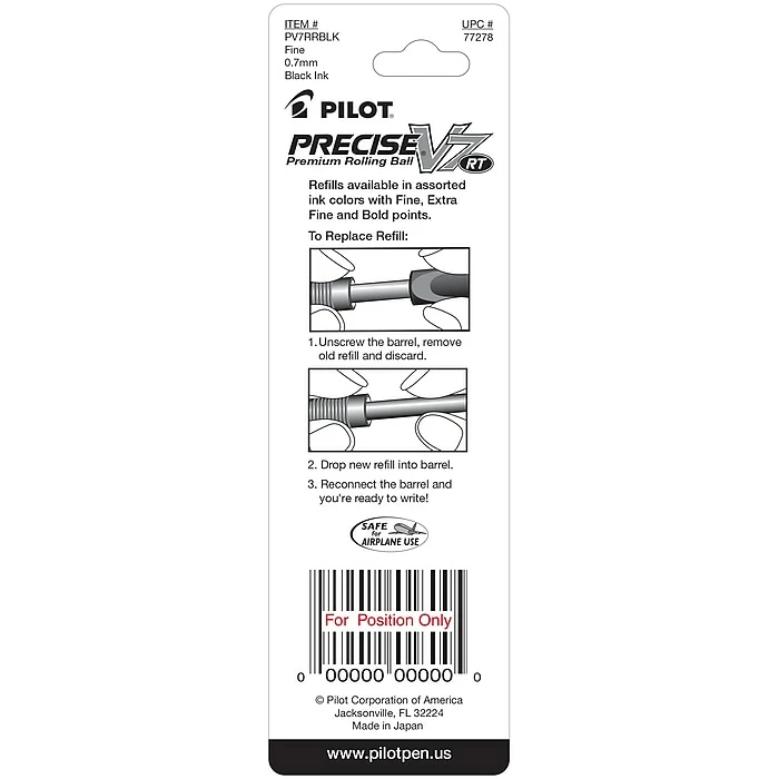 Produce smooth and consistent strokes with the Pilot Precise V7 RT Rolling Ball Pen Refill. This refill comes with a conical fine point tip for sharp and clear writing. The Patented Precision Point Technology enables free flow of ink from tip to paper for skip-free lines. It dries quickly and is water-resistant to keep text legible even after water damage. Convenient to use, this fine point refill is specially designed for Pilot Precise V7 RT Rolling Ball Pen. It can be easily replaced whenever required.