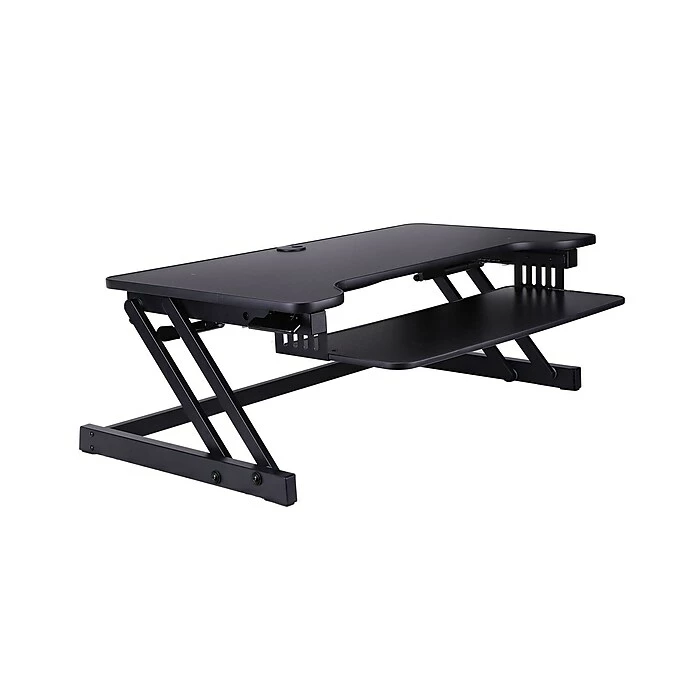 Enjoy the health benefits using this Deluxe Sit-to-Stand Adjustable Desk Riser, DADR. The desk top is extra large, 37.5″ x 20.5″, comfortably holding 2-3 monitors and a laptop. Easy to use handles on the side allows continuous height adjustment from 5″ up to 17″. A retractable keyboard tray offers the ergonomically correct position whether you’re sitting or standing.
