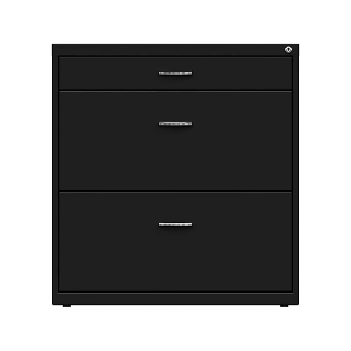 - Three-drawer lateral file cabinet designed for small office or home office use