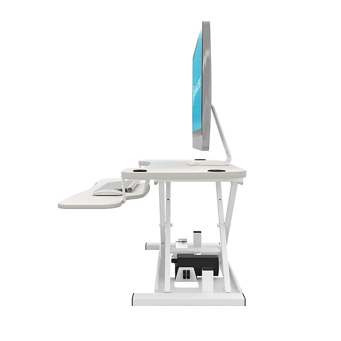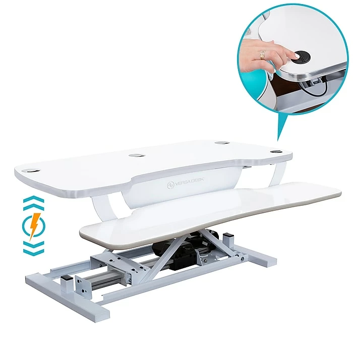 VersaDesk is the first electric standing desk converter on the market. Just make space on your current desk or table, remove the VersaDesk from the box, plug it in, attach the keyboard and you are ready to go. With the push of a button, it is easy to move to a sitting or standing position in seconds without disrupting work flow. The desktop includes two tiered surfaces available in 4 colors and 4 sizes. One surface holds the mouse and keyboard, while the other provides work space and room for a monitor. The VersaDesk vertically adjusts from 5 inches to 20 inches and does all the heavy lifting- its powerful motor lifts up to 80 pounds of equipment. This electric standing desktop is the “no-brainer” solution for those who like their current desk and do not want to invest in a full sit-to-stand desk. The VersaDesk is backed by a Limited Lifetime Warranty.